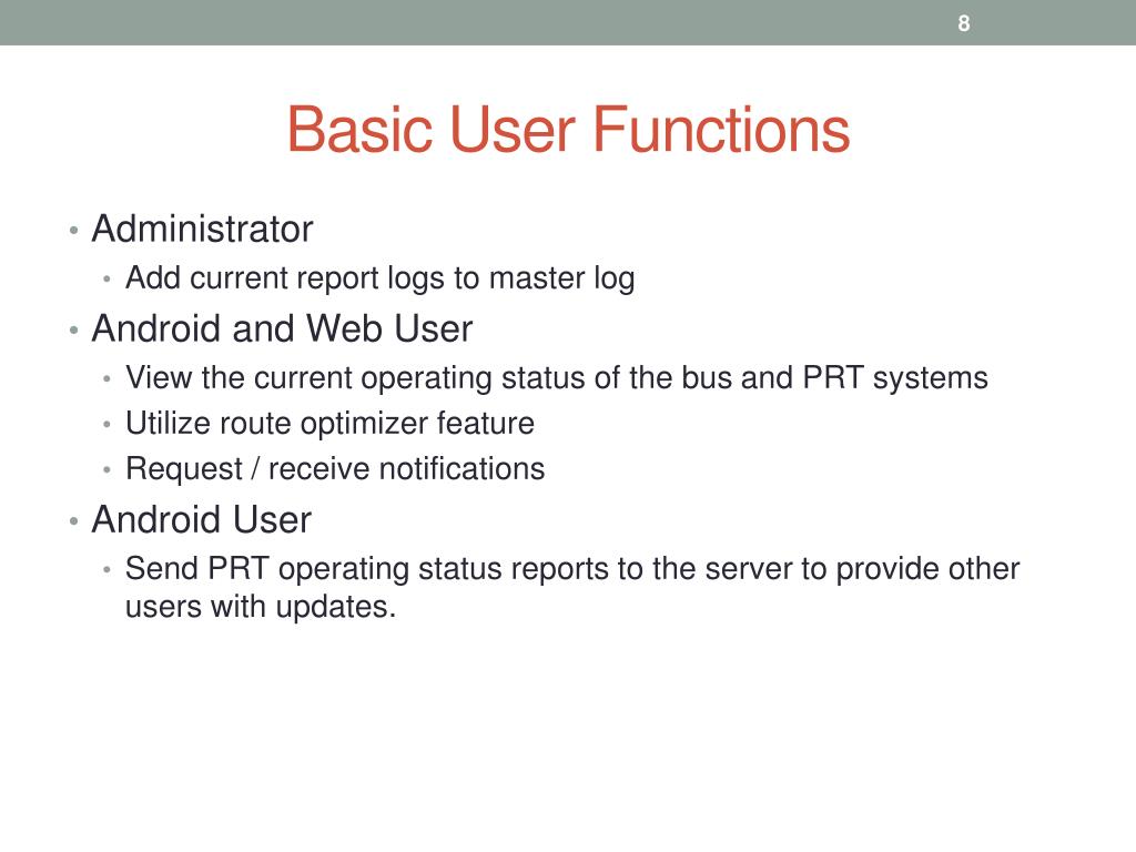 Basic User Functions • Administrator • Add current report logs to master log • Android and Web User • View the current operating status of the bus and PRT systems • Utilize route optimizer feature • Request / receive notifications • Android User • Send PRT operating status reports to the server to provide other users with updates.