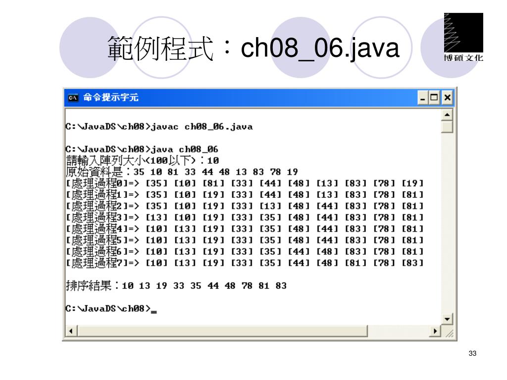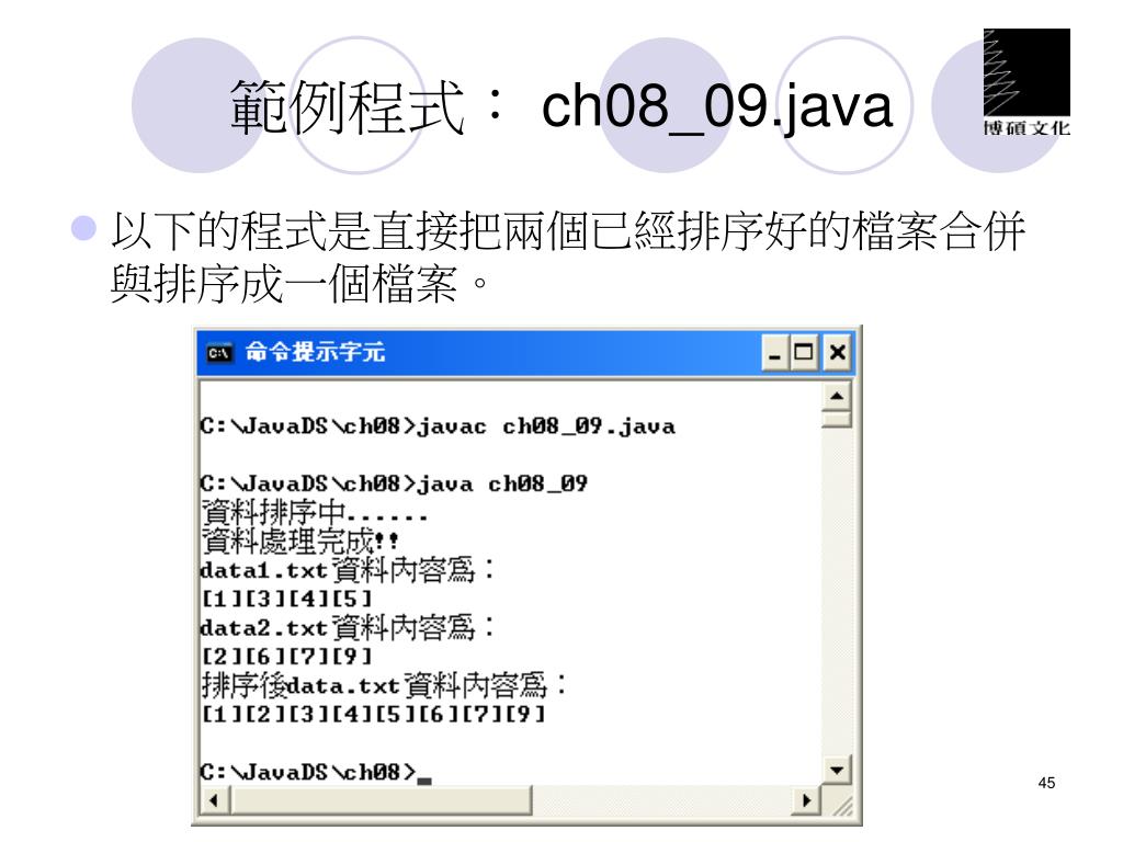 範例程式: ch08_09.java • 以下的程式是直接把兩個已經排序好的檔案合併與排序成一個檔案。