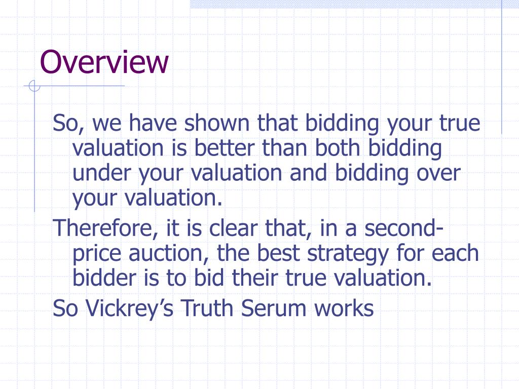 Overview So, we have shown that bidding your true valuation is better than both bidding under your valuation and bidding over your valuation. Therefore, it is clear that, in a second-price auction, the best strategy for each bidder is to bid their true valuation. So Vickrey’s Truth Serum works