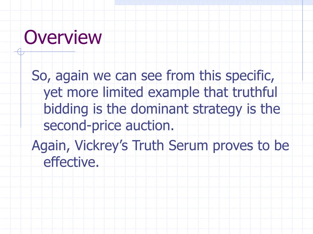Overview So, again we can see from this specific, yet more limited example that truthful bidding is the dominant strategy is the second-price auction. Again, Vickrey’s Truth Serum proves to be effective.