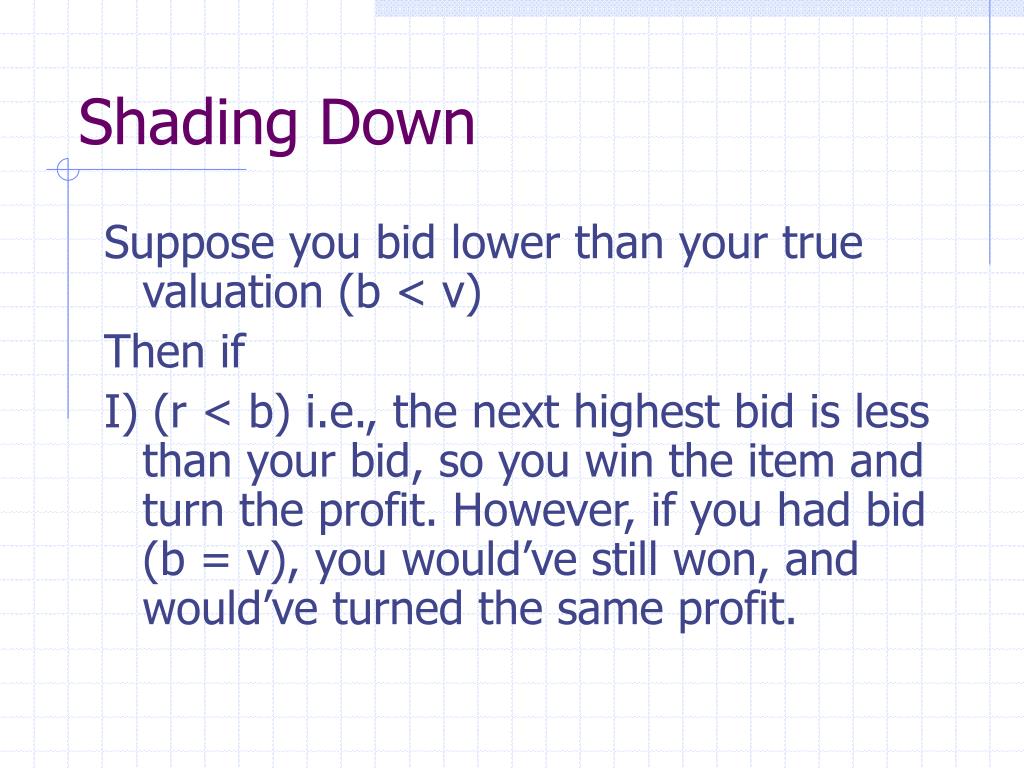 Shading Down Suppose you bid lower than your true valuation (b < v) Then if I) (r < b) i.e., the next highest bid is less than your bid, so you win the item and turn the profit. However, if you had bid (b = v), you would’ve still won, and would’ve turned the same profit.