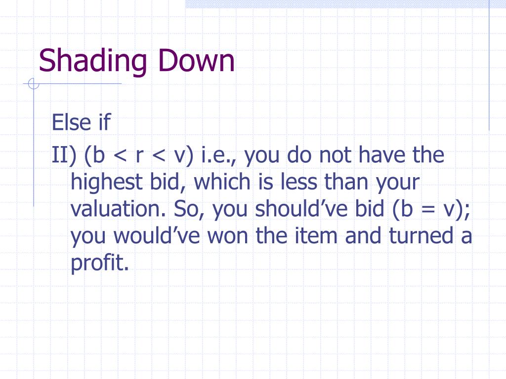 Shading Down Else if II) (b < r < v) i.e., you do not have the highest bid, which is less than your valuation. So, you should’ve bid (b = v); you would’ve won the item and turned a profit.