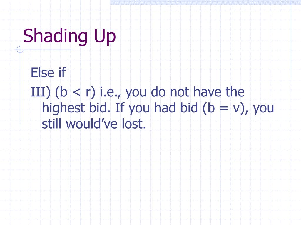 Shading Up Else if III) (b < r) i.e., you do not have the highest bid. If you had bid (b = v), you still would’ve lost.
