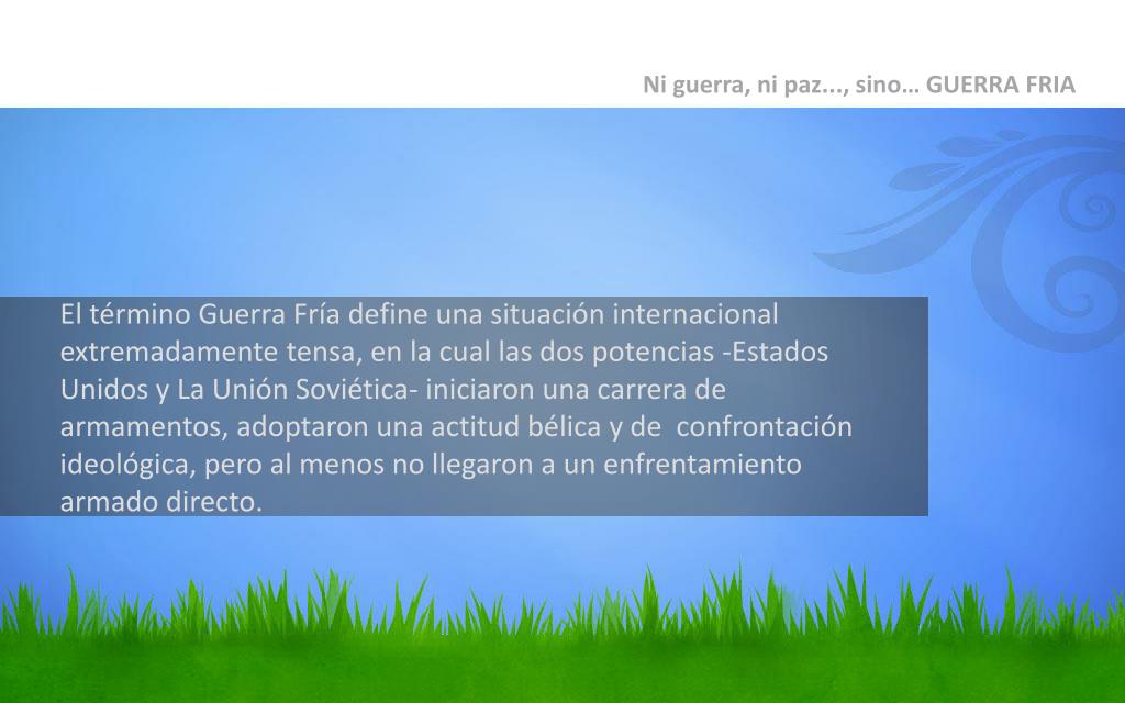 Ni guerra, ni paz..., sino… GUERRA FRIA El término Guerra Fría define una situación internacional extremadamente tensa, en la cual las dos potencias -Estados Unidos y La Unión Soviética- iniciaron una carrera de armamentos, adoptaron una actitud bélica y de confrontación ideológica, pero al menos no llegaron a un enfrentamiento armado directo.