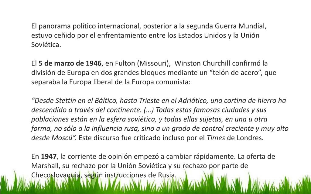 El panorama político internacional, posterior a la segunda Guerra Mundial, estuvo ceñido por el enfrentamiento entre los Estados Unidos y la Unión Soviética. El 5 de marzo de 1946, en Fulton (Missouri), Winston Churchill confirmó la división de Europa en dos grandes bloques mediante un “telón de acero”, que separaba la Europa liberal de la Europa comunista: “Desde Stettin en el Báltico, hasta Trieste en el Adriático, una cortina de hierro ha descendido a través del continente. (…) Todas estas famosas ciudades y sus poblaciones están en la esfera soviética, y todas ellas sujetas, en una u otra forma, no sólo a la influencia rusa, sino a un grado de control creciente y muy alto desde Moscú”. Este discurso fue criticado incluso por el Times de Londres. En 1947, la corriente de opinión empezó a cambiar rápidamente. La oferta de Marshall, su rechazo por la Unión Soviética y su rechazo por parte de Checoslovaquia, según instrucciones de Rusia.