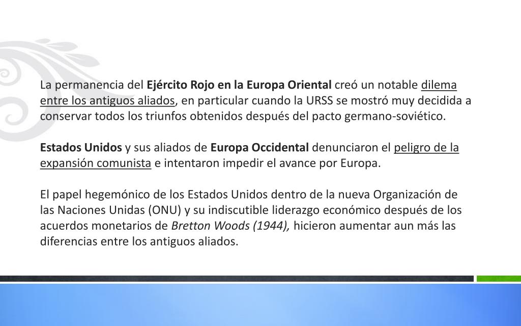 La permanencia del Ejército Rojo en la Europa Oriental creó un notable dilema entre los antiguos aliados, en particular cuando la URSS se mostró muy decidida a conservar todos los triunfos obtenidos después del pacto germano-soviético. Estados Unidos y sus aliados de Europa Occidental denunciaron el peligro de la expansión comunista e intentaron impedir el avance por Europa. El papel hegemónico de los Estados Unidos dentro de la nueva Organización de las Naciones Unidas (ONU) y su indiscutible liderazgo económico después de los acuerdos monetarios de Bretton Woods (1944), hicieron aumentar aun más las diferencias entre los antiguos aliados.