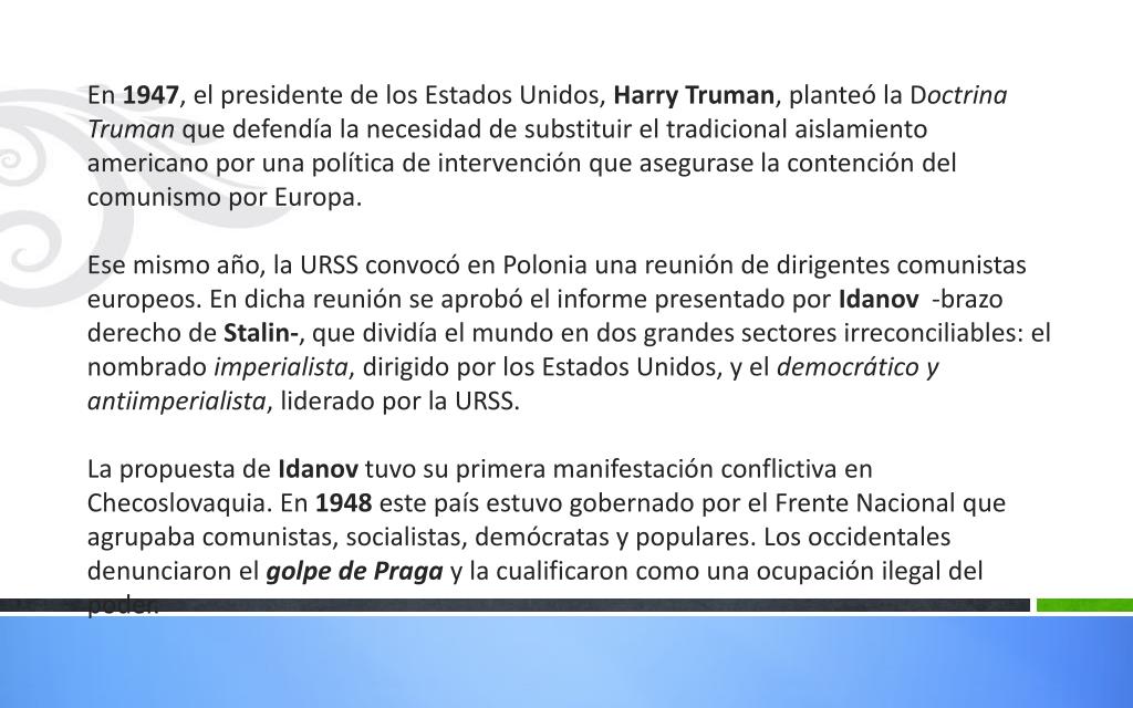 En 1947, el presidente de los Estados Unidos, Harry Truman, planteó la Doctrina Truman que defendía la necesidad de substituir el tradicional aislamiento americano por una política de intervención que asegurase la contención del comunismo por Europa. Ese mismo año, la URSS convocó en Polonia una reunión de dirigentes comunistas europeos. En dicha reunión se aprobó el informe presentado por Idanov -brazo derecho de Stalin-, que dividía el mundo en dos grandes sectores irreconciliables: el nombrado imperialista, dirigido por los Estados Unidos, y el democrático y antiimperialista, liderado por la URSS. La propuesta de Idanovtuvo su primera manifestación conflictiva en Checoslovaquia. En 1948 este país estuvo gobernado por el Frente Nacional que agrupaba comunistas, socialistas, demócratas y populares. Los occidentales denunciaron el golpe de Pragay la cualificaron como una ocupación ilegal del poder.