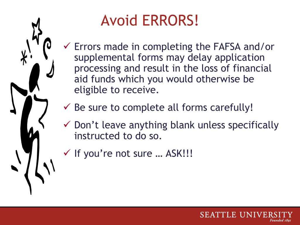 Avoid ERRORS! • Errors made in completing the FAFSA and/or supplemental forms may delay application processing and result in the loss of financial aid funds which you would otherwise be eligible to receive. • Be sure to complete all forms carefully! • Don’t leave anything blank unless specifically instructed to do so. • If you’re not sure … ASK!!!