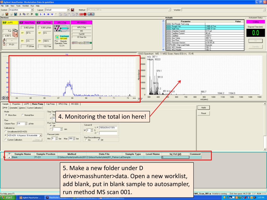 4. Monitoring the total ion here! 5. Make a new folder under D drive>masshunter>data. Open a new worklist, add blank, put in blank sample to autosampler, run method MS scan 001.