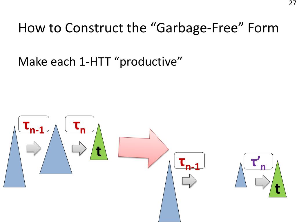 How to Construct the “Garbage-Free” Form Make each 1-HTT “productive”by separating its “deleting” part = τn τ’del τ’n τn-1 τn t τn-1 τ’del τ’n t
