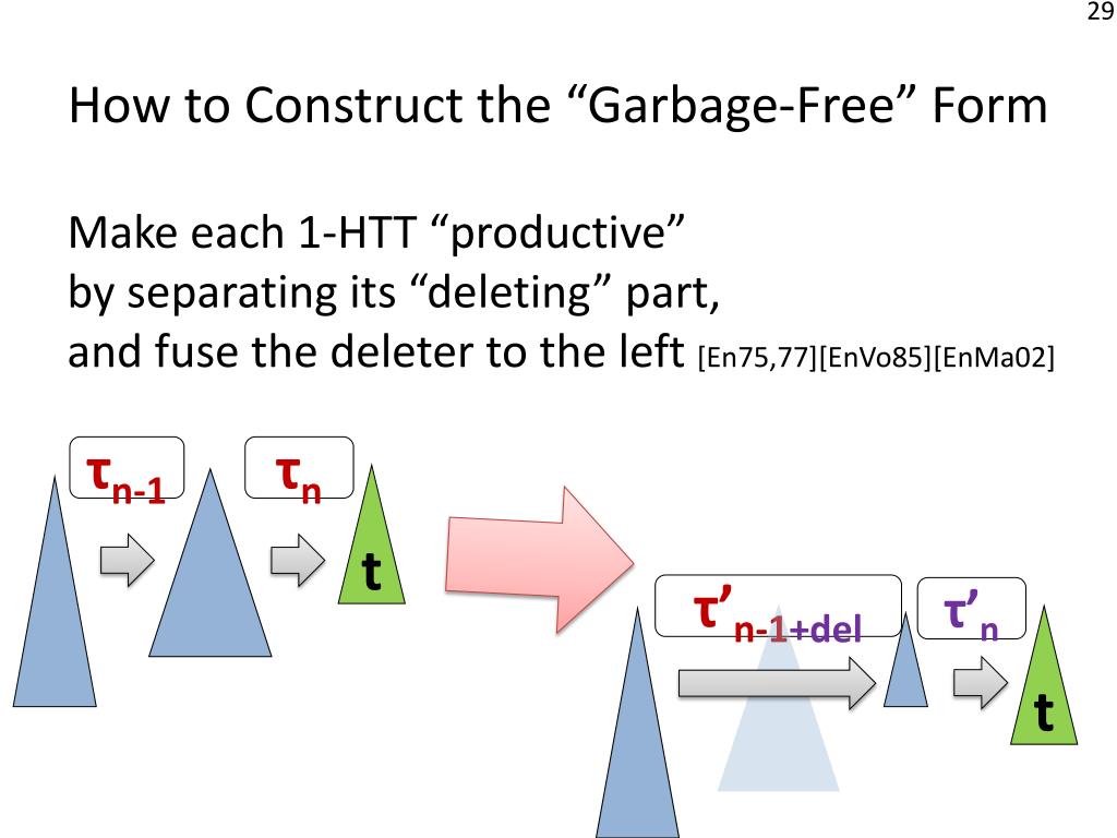 How to Construct the “Garbage-Free” Form Make each 1-HTT “productive”by separating its “deleting” part,and fuse the deleter to the left [En75,77][EnVo85][EnMa02] τn-1 τn t τ’n-1+del τ’n t