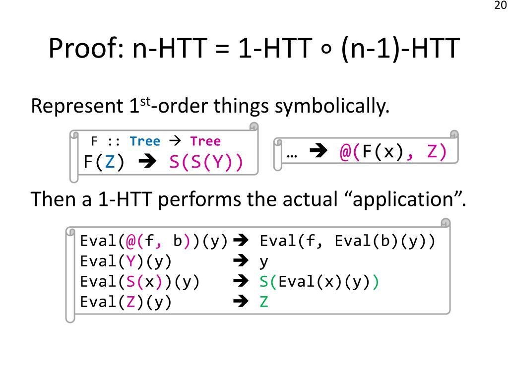 Proof: n-HTT = 1-HTT ∘ (n-1)-HTT Represent 1st-order things symbolically. Then a 1-HTT performs the actual “application”. F :: Tree Tree F(Z) S(S(Y)) … @(F(x), Z) Eval(@(f, b))(y) Eval(f, Eval(b)(y)) Eval(Y)(y) y Eval(S(x))(y) S(Eval(x)(y)) Eval(Z)(y) Z