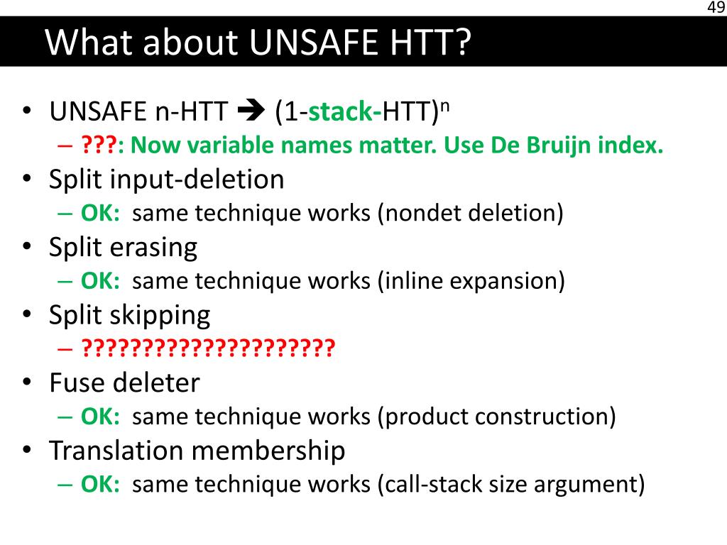 What about UNSAFE HTT? • UNSAFE n-HTT (1-stack-HTT)n • ???:Now variable names matter. Use De Bruijn index. • Split input-deletion • OK: same technique works (nondet deletion) • Split erasing • OK: same technique works (inline expansion) • Split skipping • ????????????????????? • Fuse deleter • OK: same technique works (product construction) • Translation membership • OK: same technique works (call-stack size argument)