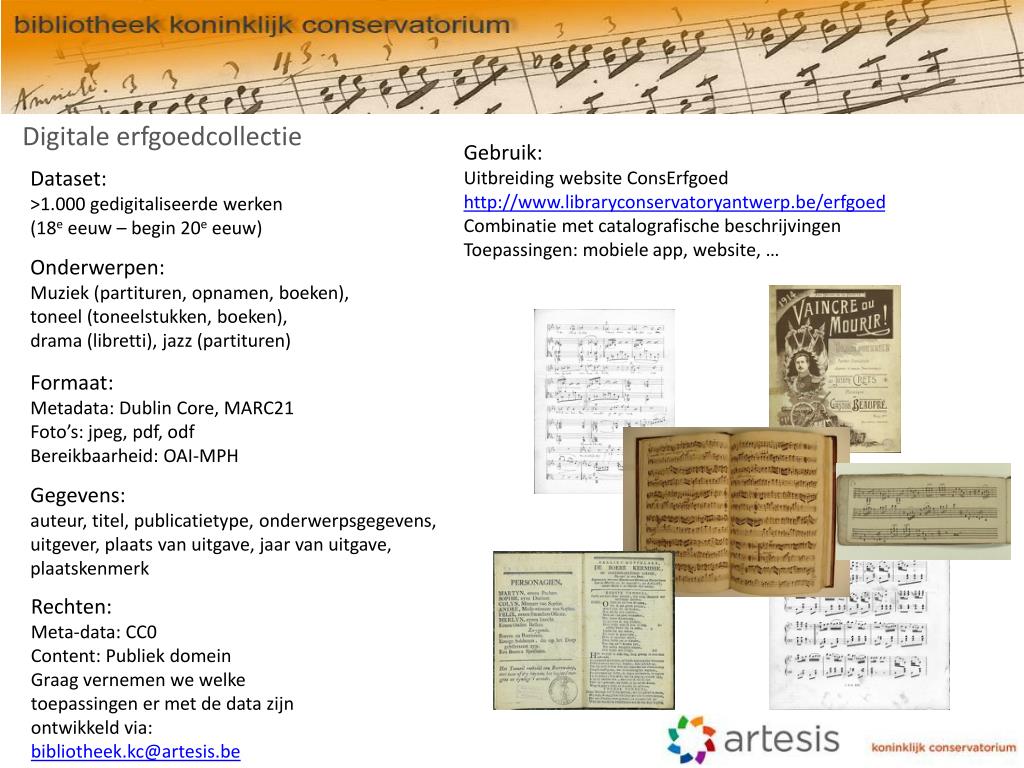 Digitale erfgoedcollectie Gebruik: Uitbreiding website ConsErfgoed http://www.libraryconservatoryantwerp.be/erfgoed Combinatie met catalografische beschrijvingen Toepassingen: mobiele app, website, … Dataset: >1.000 gedigitaliseerde werken (18e eeuw– begin 20e eeuw) Onderwerpen: Muziek (partituren, opnamen, boeken), toneel (toneelstukken, boeken), drama (libretti), jazz (partituren) Formaat: Metadata: Dublin Core, MARC21 Foto’s: jpeg, pdf, odf Bereikbaarheid: OAI-MPH Gegevens: auteur, titel, publicatietype, onderwerpsgegevens, uitgever, plaats van uitgave, jaar van uitgave, plaatskenmerk Rechten: Meta-data: CC0 Content: Publiek domein Graag vernemen we welke toepassingen er met de data zijn ontwikkeld via: bibliotheek.kc@artesis.be