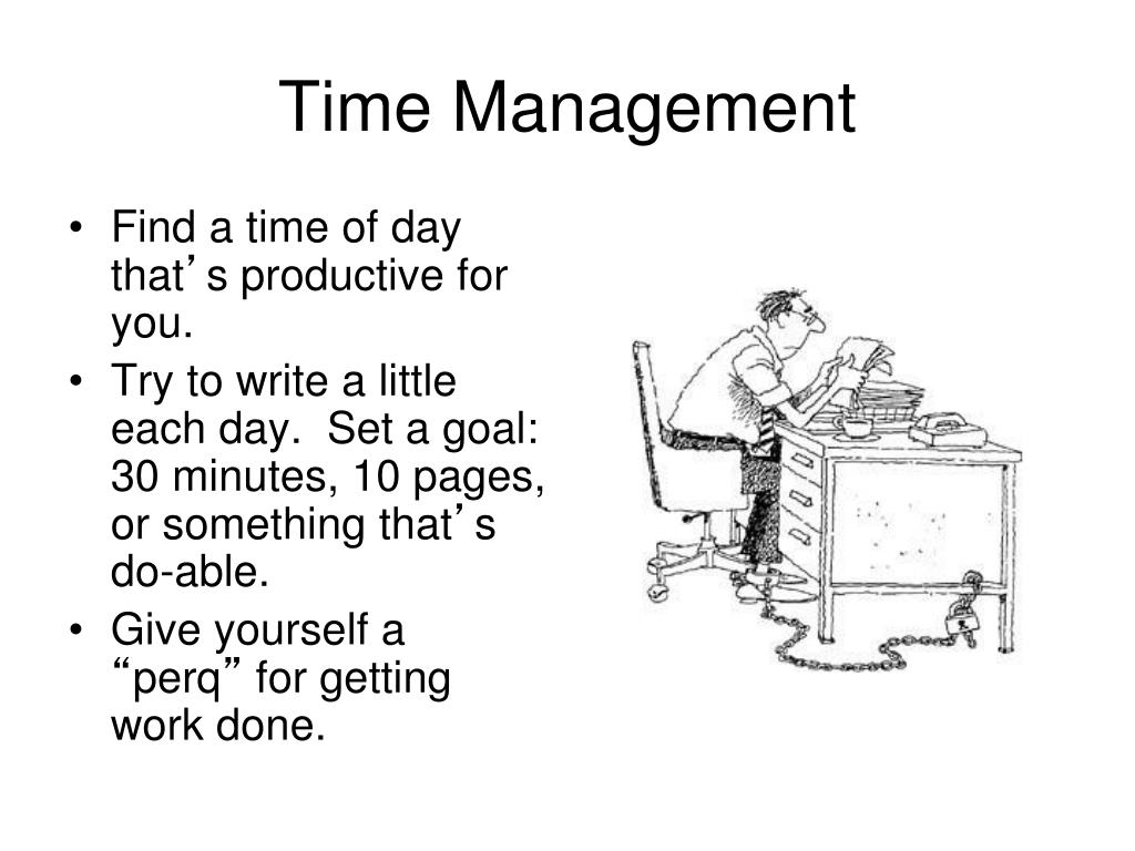 Time Management • Find a time of day that’s productive for you. • Try to write a little each day. Set a goal: 30 minutes, 10 pages, or something that’s do-able. • Give yourself a “perq” for getting work done.