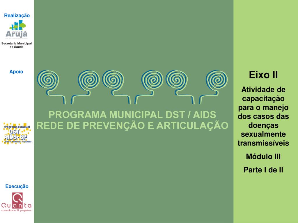 Realização HIV/Aids: Aspectos gerais, estigma e cuidados éticos: Garantindo o cumprimento das diretrizes dos SUS Apoio Eixo II Atividade de capacitação para o manejo dos casos das doenças sexualmente transmissíveis Módulo III Parte I de II Rede de Prevenção e Comunicação do Programa Municipal DST/HIV-AIDS Execução