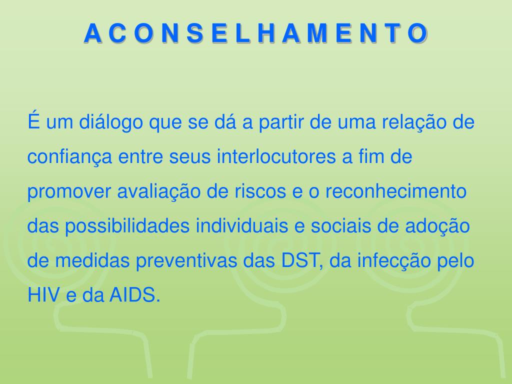 A C O N S E L H A M E N T O É um diálogo que se dá a partir de uma relação de confiança entre seus interlocutores a fim de promover avaliação de riscos e o reconhecimento das possibilidades individuais e sociais de adoção de medidas preventivas das DST, da infecção pelo HIV e da AIDS.