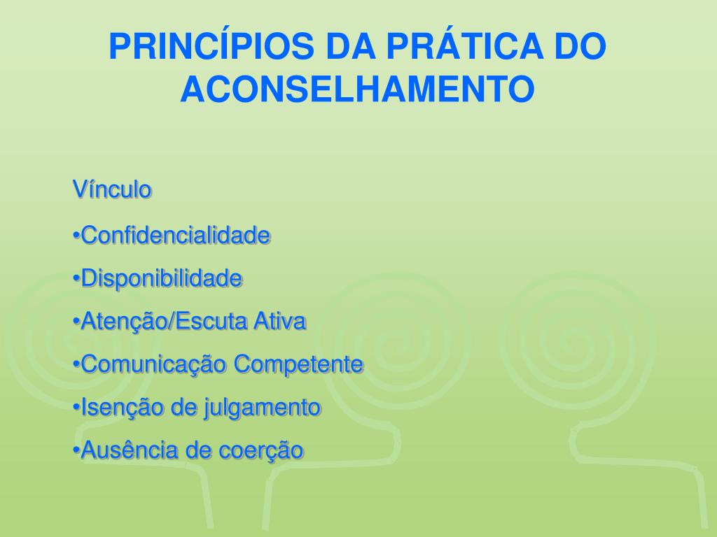 PRINCÍPIOS DA PRÁTICA DO ACONSELHAMENTO • Vínculo • Confidencialidade • Disponibilidade • Atenção/Escuta Ativa • Comunicação Competente • Isenção de julgamento • Ausência de coerção