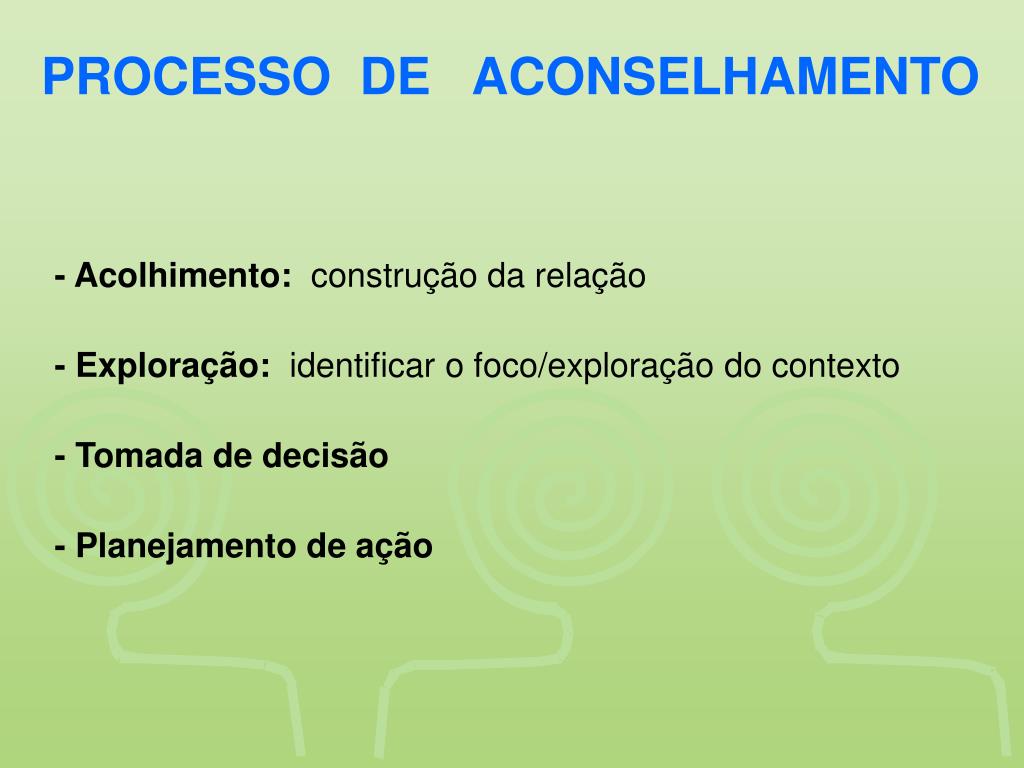 PROCESSO DE ACONSELHAMENTO - Acolhimento: construção da relação - Exploração: identificar o foco/exploração do contexto - Tomada de decisão - Planejamento de ação