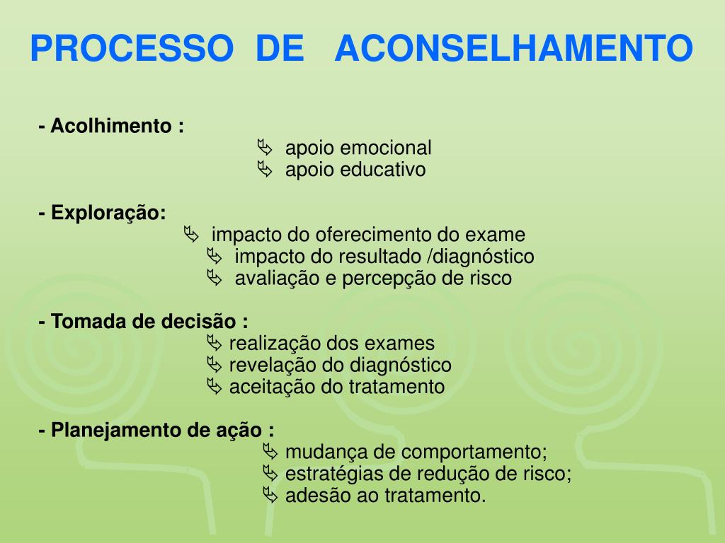 PROCESSO DE ACONSELHAMENTO - Acolhimento : apoio emocional apoio educativo - Exploração: impacto do oferecimento do exame impacto do resultado /diagnóstico avaliação e percepção de risco - Tomada de decisão : realização dos exames revelação do diagnóstico aceitação do tratamento - Planejamento de ação : mudança de comportamento; estratégias de redução de risco; adesão ao tratamento.