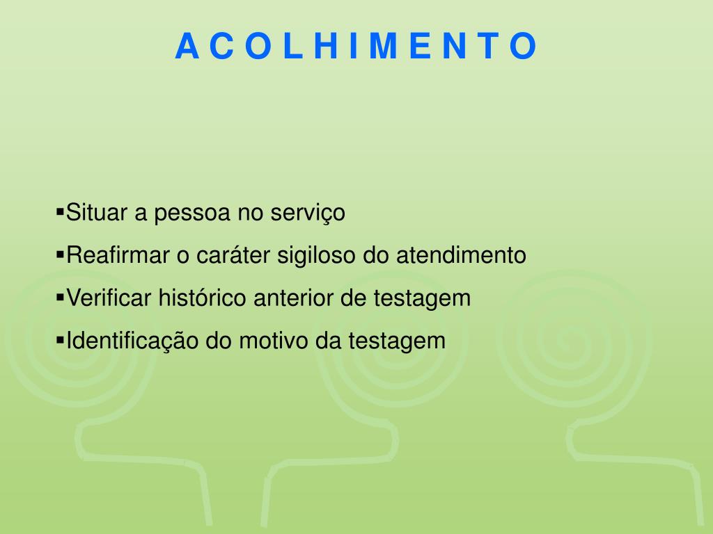 A C O L H I M E N T O • Situar a pessoa no serviço • Reafirmar o caráter sigiloso do atendimento • Verificar histórico anterior de testagem • Identificação do motivo da testagem
