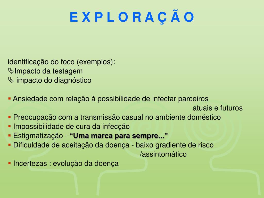 E X P L O R A Ç Ã O • identificação do foco (exemplos): • Impacto da testagem • impacto do diagnóstico • Ansiedade com relação à possibilidade de infectar parceiros atuais e futuros • Preocupação com a transmissão casual no ambiente doméstico • Impossibilidade de cura da infecção • Estigmatização - “Uma marca para sempre...” • Dificuldade de aceitação da doença - baixo gradiente de risco /assintomático • Incertezas : evolução da doença