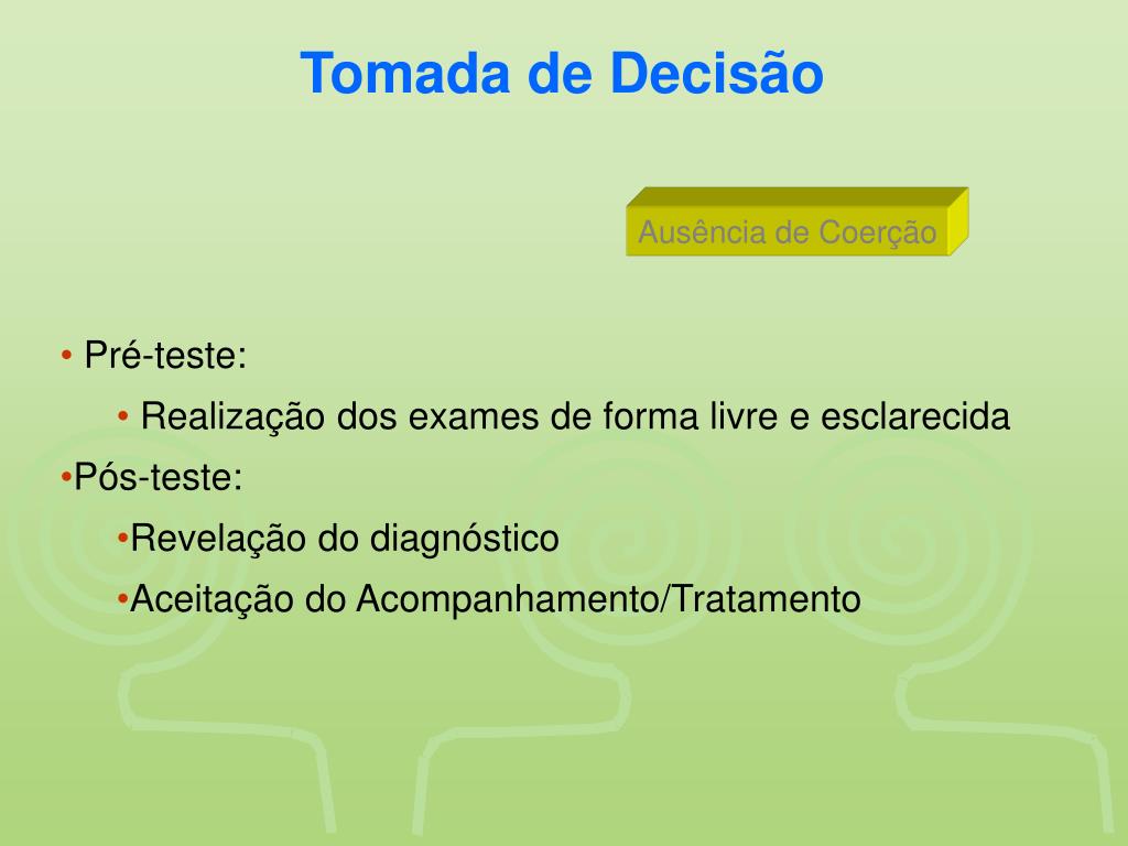 Tomada de Decisão Ausência de Coerção • Pré-teste: • Realização dos exames de forma livre e esclarecida • Pós-teste: • Revelação do diagnóstico • Aceitação do Acompanhamento/Tratamento