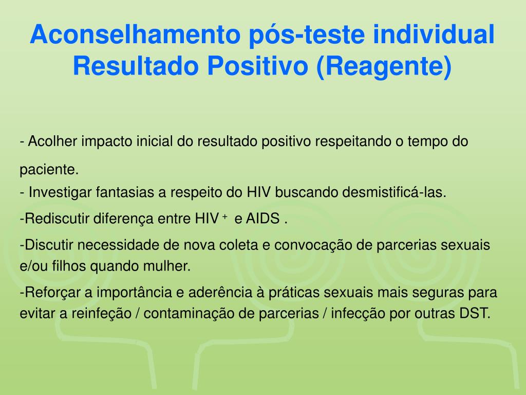 Aconselhamento pós-teste individual Resultado Positivo (Reagente) • - Acolher impacto inicial do resultado positivo respeitando o tempo do paciente. • - Investigar fantasias a respeito do HIV buscando desmistificá-las. • Rediscutir diferença entre HIV + e AIDS . • -Discutir necessidade de nova coleta e convocação de parcerias sexuais e/ou filhos quando mulher. • -Reforçar a importância e aderência à práticas sexuais mais seguras para evitar a reinfeção / contaminação de parcerias / infecção por outras DST.