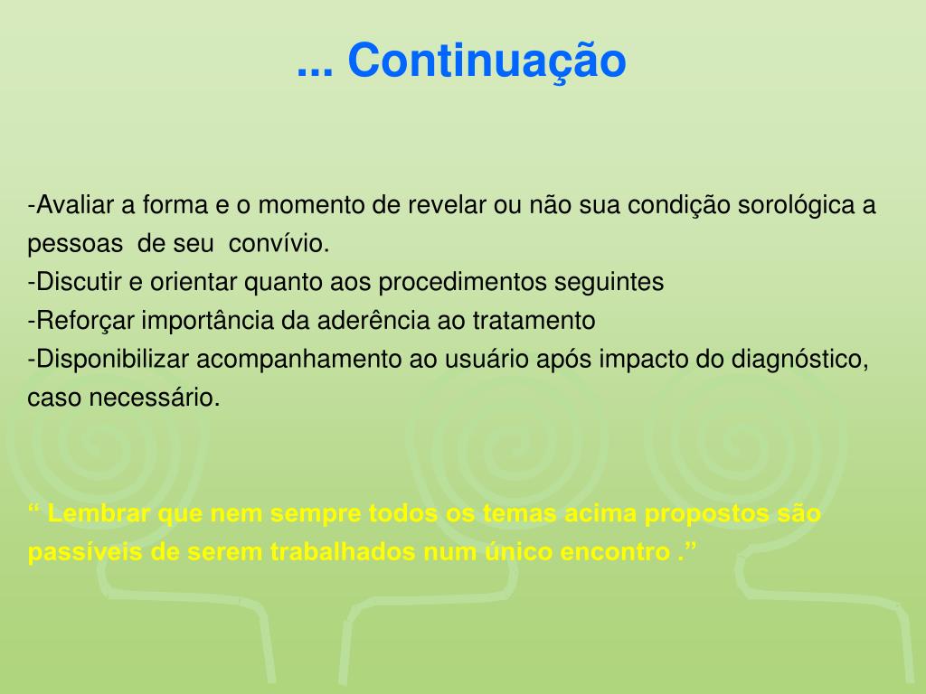 ... Continuação • -Avaliar a forma e o momento de revelar ou não sua condição sorológica a pessoas de seu convívio. • Discutir e orientar quanto aos procedimentos seguintes • Reforçar importância da aderência ao tratamento • Disponibilizar acompanhamento ao usuário após impacto do diagnóstico, caso necessário. • “ Lembrar que nem sempre todos os temas acima propostos são passíveis de serem trabalhados num único encontro .”