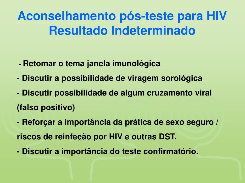 Aconselhamento pós-teste para HIV Resultado Indeterminado -Retomar o tema janela imunológica - Discutir a possibilidade de viragem sorológica - Discutir possibilidade de algum cruzamento viral (falso positivo) - Reforçar a importância da prática de sexo seguro / riscos de reinfeção por HIV e outras DST. - Discutir a importância do teste confirmatório.