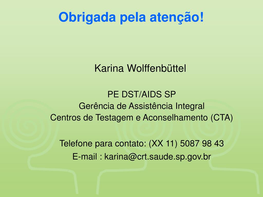 Obrigada pela atenção! Karina Wolffenbüttel PE DST/AIDS SP Gerência de Assistência Integral Centros de Testagem e Aconselhamento (CTA) Telefone para contato: (XX 11) 5087 98 43 E-mail : karina@crt.saude.sp.gov.br