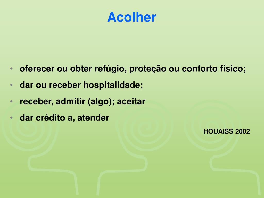 Acolher • oferecer ou obter refúgio, proteção ou conforto físico; • dar ou receber hospitalidade; • receber, admitir (algo); aceitar • dar crédito a, atender HOUAISS 2002
