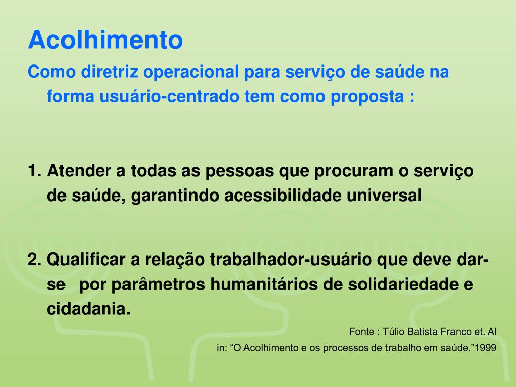Acolhimento • Como diretriz operacional para serviço de saúde na forma usuário-centrado tem como proposta : • Atender a todas as pessoas que procuram o serviço de saúde, garantindo acessibilidade universal • 2. Qualificar a relação trabalhador-usuário que deve dar-se por parâmetros humanitários de solidariedade e cidadania. • Fonte : Túlio Batista Franco et. Al • in: “O Acolhimento e os processos de trabalho em saúde.”1999