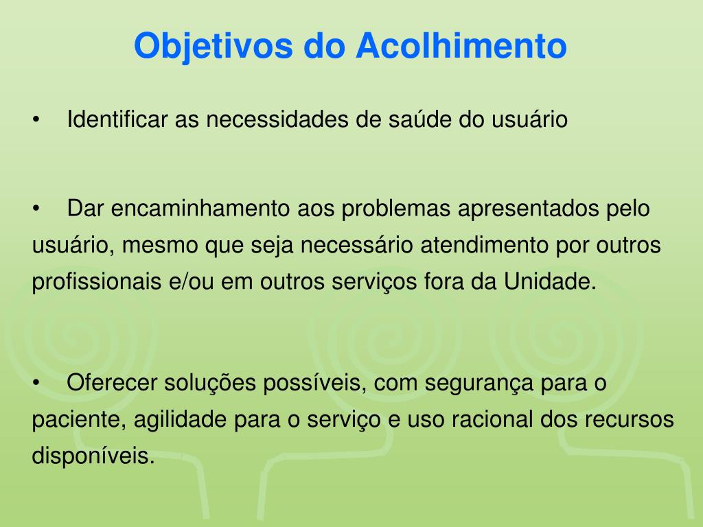 Objetivos do Acolhimento • Identificar as necessidades de saúde do usuário • Dar encaminhamento aos problemas apresentados pelo usuário, mesmo que seja necessário atendimento por outros profissionais e/ou em outros serviços fora da Unidade. • Oferecer soluções possíveis, com segurança para o paciente, agilidade para o serviço e uso racional dos recursos disponíveis.