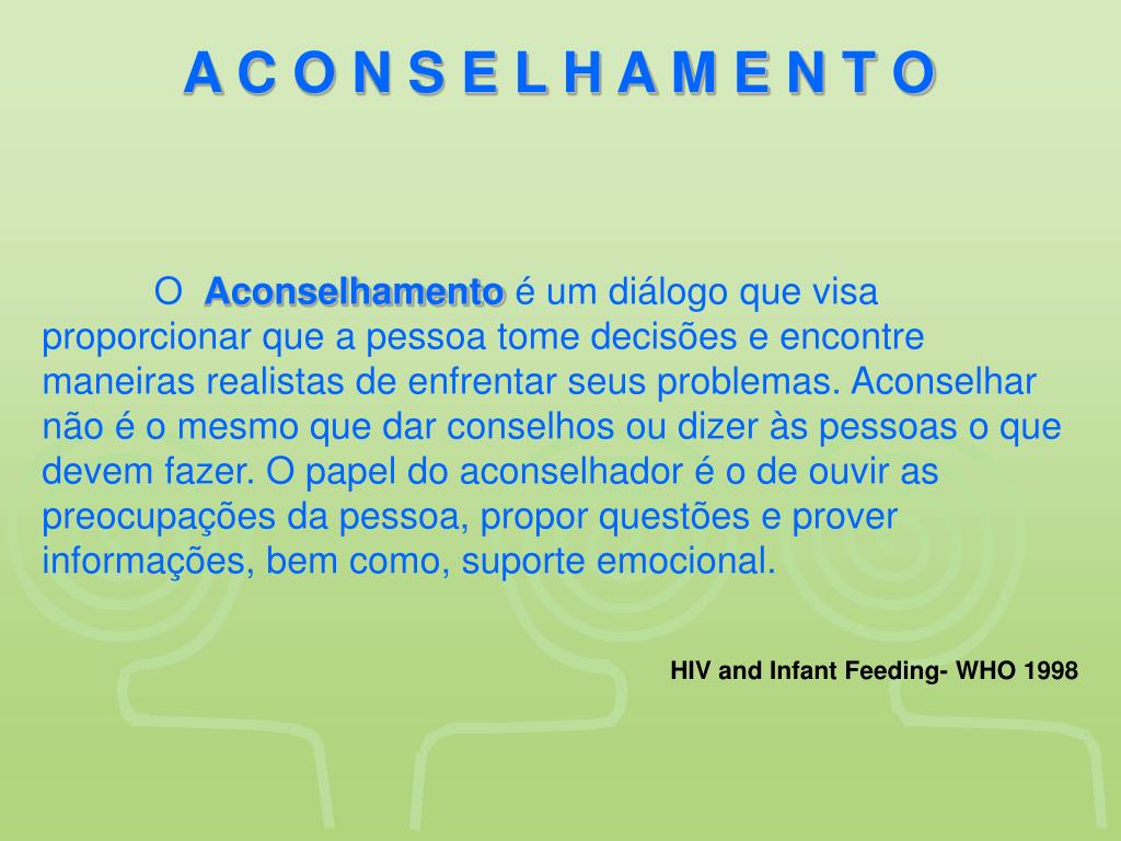 A C O N S E L H A M E N T O O Aconselhamento é um diálogo que visa proporcionar que a pessoa tome decisões e encontre maneiras realistas de enfrentar seus problemas. Aconselhar não é o mesmo que dar conselhos ou dizer às pessoas o que devem fazer. O papel do aconselhador é o de ouvir as preocupações da pessoa, propor questões e prover informações, bem como, suporte emocional. HIV and Infant Feeding- WHO 1998