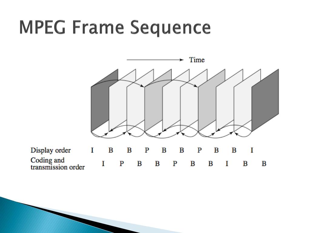 Typical Sizes of MPEG-1 Frames • The typical size of compressed P-frames is significantly smaller than that of I-frames — because temporal redundancy is exploited in inter-frame compression. • B-frames are even smaller than P-frames — because of (a) the advantage of bi-directional prediction and (b) the lowest priority given to B-frames.