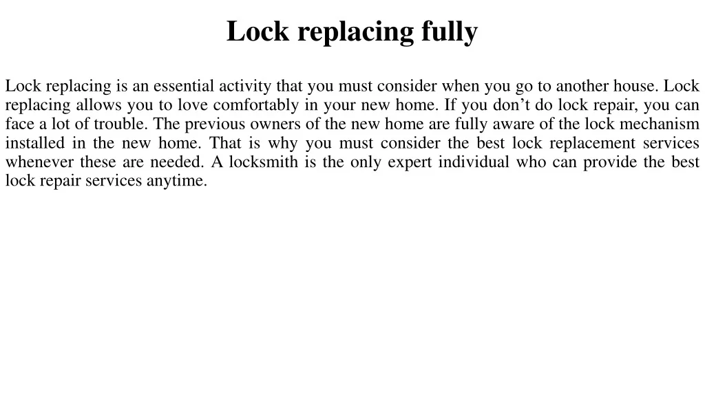 Lock replacing fully Lock replacing is an essential activity that you must consider when you go to another house. Lock replacing allows you to love comfortably in your new home. If you don’t do lock repair, you can face a lot of trouble. The previous owners of the new home are fully aware of the lock mechanism installed in the new home. That is why you must consider the best lock replacement services whenever these are needed. A locksmith is the only expert individual who can provide the best lock repair services anytime.
