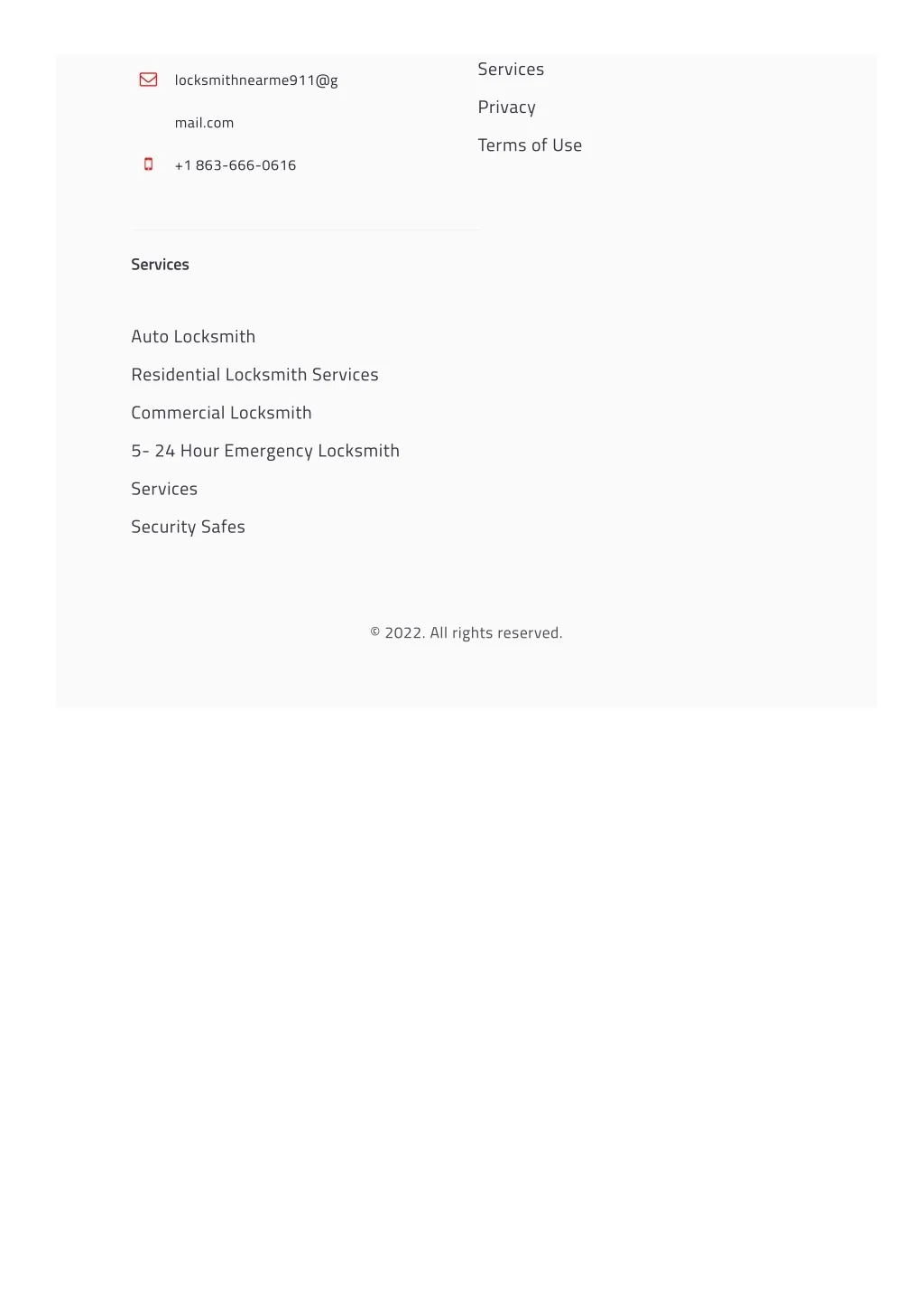 Services locksmithnearme911@g Privacy mail.com Terms of Use +1 863-666-0616 Services Auto Locksmith Residential Locksmith Services Commercial Locksmith 5- 24 Hour Emergency Locksmith Services Security Safes © 2022. All rights reserved.