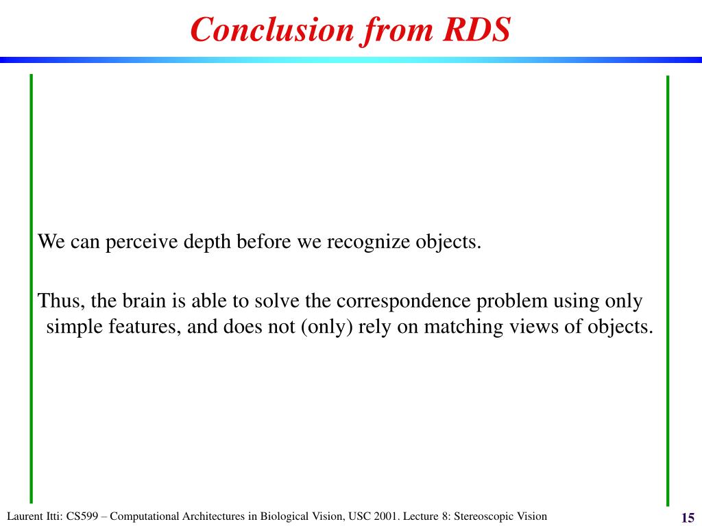 Conclusion from RDS • We can perceive depth before we recognize objects. • Thus, the brain is able to solve the correspondence problem using only simple features, and does not (only) rely on matching views of objects.