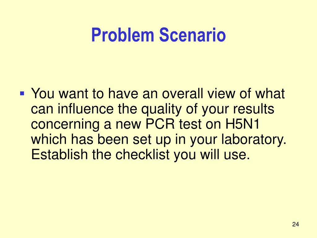 Problem Scenario • You want to have an overall view of what can influence the quality of your results concerning a new PCR test on H5N1 which has been set up in your laboratory. Establish the checklist you will use.