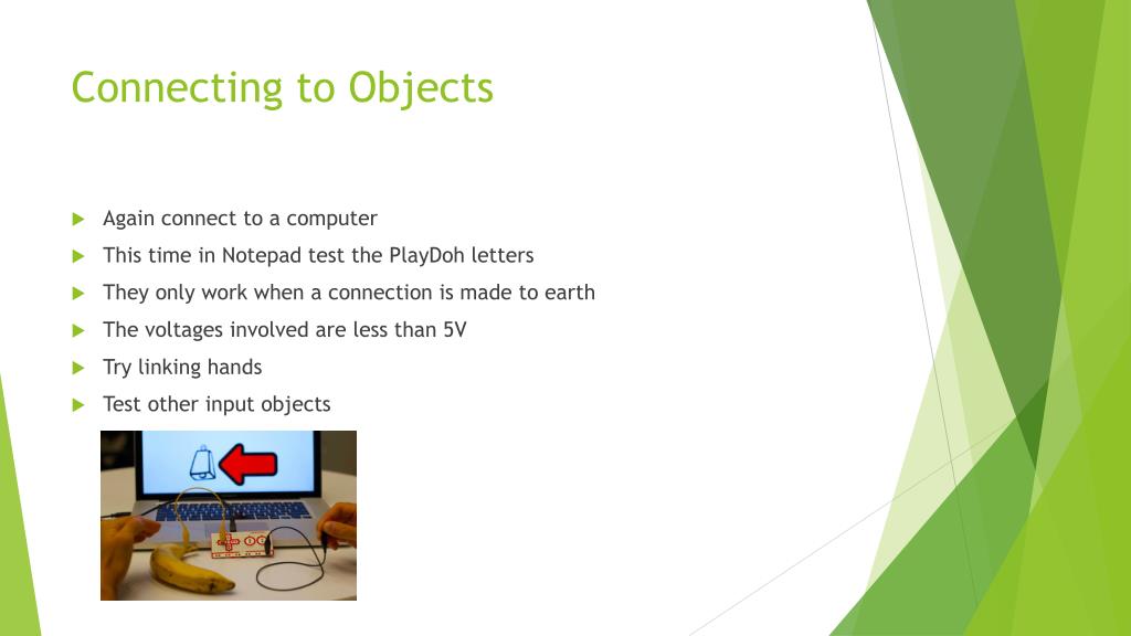 Connecting to Objects • Again connect to a computer • This time in Notepad test the PlayDoh letters • They only work when a connection is made to earth • The voltages involved are less than 5V • Try linking hands • Test other input objects