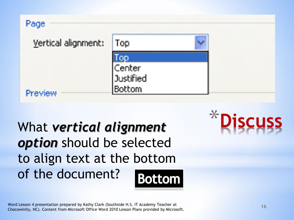 What vertical alignment option should be selected to align text at the bottom of the document? Discuss Bottom Word Lesson 4 presentation prepared by Kathy Clark (Southside H.S. IT Academy Teacher at Chocowinity, NC). Content from Microsoft Office Word 2010 Lesson Plans provided by Microsoft.
