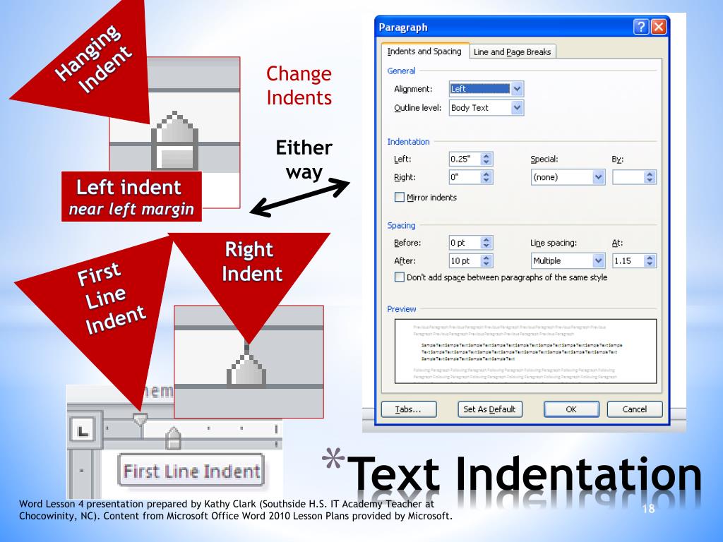 Hanging Indent Change Indents Either way Left indent near left margin Right Indent First Line Indent Text Indentation Word Lesson 4 presentation prepared by Kathy Clark (Southside H.S. IT Academy Teacher at Chocowinity, NC). Content from Microsoft Office Word 2010 Lesson Plans provided by Microsoft.