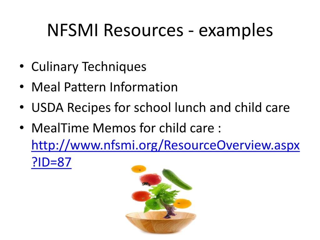 NFSMI Resources - examples • Culinary Techniques • Meal Pattern Information • USDA Recipes for school lunch and child care • MealTime Memos for child care : http://www.nfsmi.org/ResourceOverview.aspx?ID=87