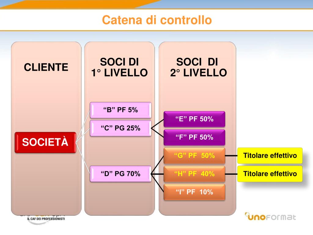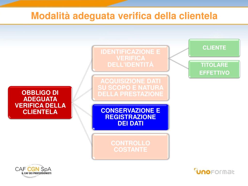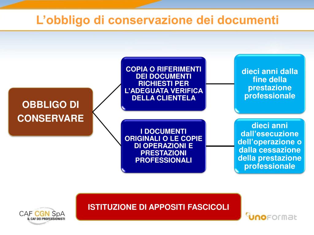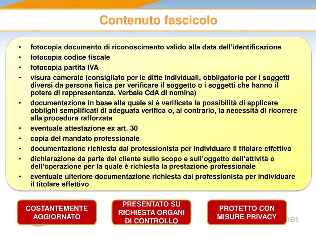 Contenuto fascicolo • fotocopia documento di riconoscimento valido alla data dell’identificazione • fotocopia codice fiscale • fotocopia partita IVA • visura camerale (consigliato per le ditte individuali, obbligatorio per i soggetti diversi da persona fisica per verificare il soggetto o i soggetti che hanno il potere di rappresentanza. Verbale CdA di nomina) • documentazione in base alla quale si è verificata la possibilità di applicare obblighi semplificati di adeguata verifica o, al contrario, la necessità di ricorrere alla procedura rafforzata • eventuale attestazione ex art. 30 • copia del mandato professionale • documentazione richiesta dal professionista per individuare il titolare effettivo • dichiarazione da parte del cliente sullo scopo e sull’oggetto dell’attività o dell’operazione per la quale è richiesta la prestazione professionale • eventuale ulteriore documentazione richiesta dal professionista per individuare il titolare effettivo COSTANTEMENTE AGGIORNATO PRESENTATO SU RICHIESTA ORGANI DI CONTROLLO PROTETTO CON MISURE PRIVACY