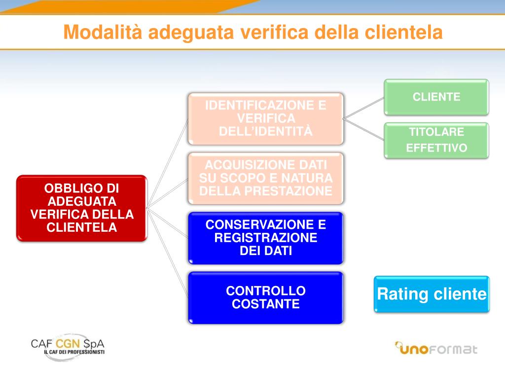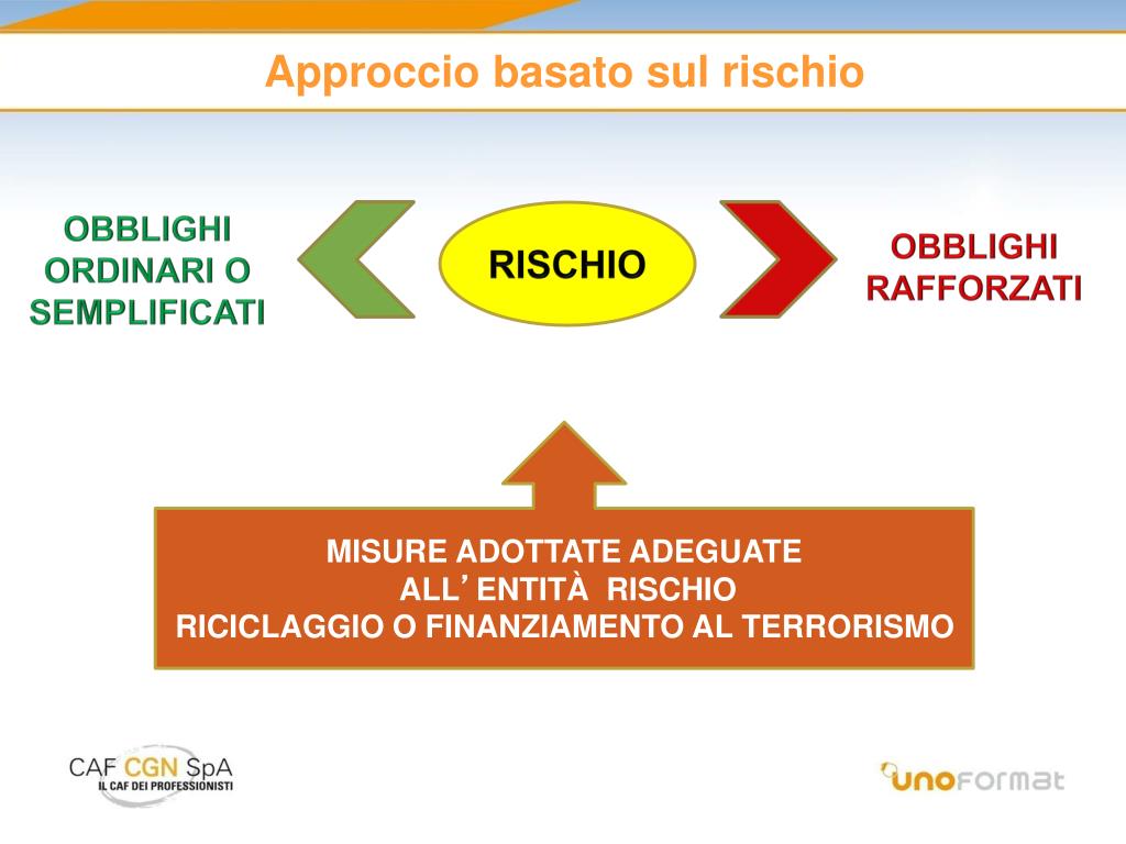 Approccio basato sul rischio OBBLIGHI ORDINARI O SEMPLIFICATI RISCHIO OBBLIGHI RAFFORZATI MISURE ADOTTATE ADEGUATEALL’ENTITÀ RISCHIO RICICLAGGIO O FINANZIAMENTO AL TERRORISMO
