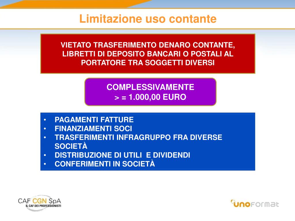 Limitazione uso contante VIETATO TRASFERIMENTO DENARO CONTANTE, LIBRETTI DI DEPOSITO BANCARI O POSTALI AL PORTATORE TRA SOGGETTI DIVERSI COMPLESSIVAMENTE > = 1.000,00 EURO • PAGAMENTI FATTURE • FINANZIAMENTI SOCI • TRASFERIMENTI INFRAGRUPPO FRA DIVERSE SOCIETÀ • DISTRIBUZIONE DI UTILI E DIVIDENDI • CONFERIMENTI IN SOCIETÀ