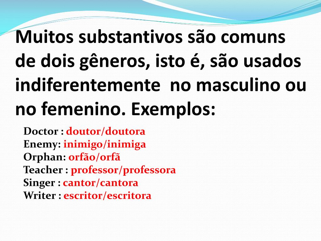 Muitos substantivos são comuns de dois gêneros, isto é, são usados indiferentemente no masculino ou no femenino. Exemplos: Doctor : doutor/doutora Enemy:inimigo/inimiga Orphan:orfão/orfã Teacher :professor/professora Singer : cantor/cantora Writer : escritor/escritora