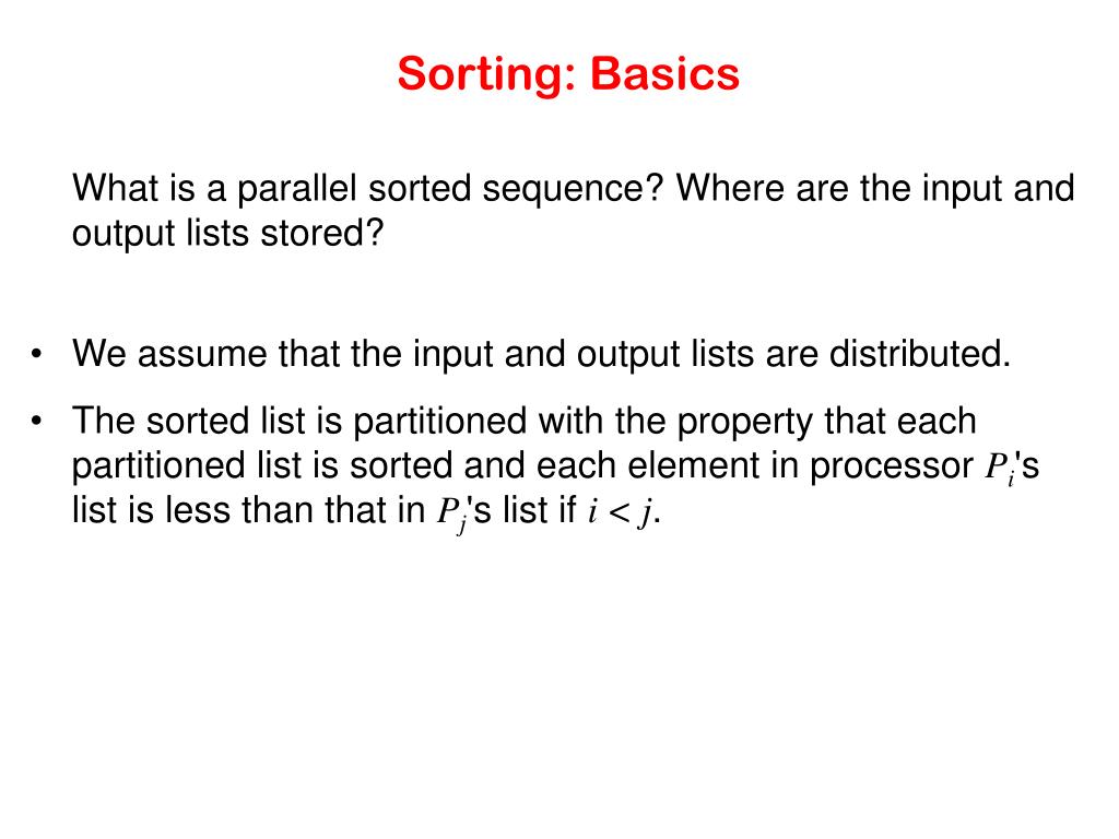 Sorting: Basics What is a parallel sorted sequence? Where are the input and output lists stored? • We assume that the input and output lists are distributed. • The sorted list is partitioned with the property that each partitioned list is sorted and each element in processor Pi's list is less than that in Pj's list if i < j.