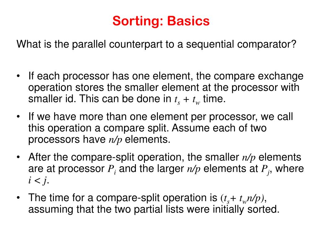 Sorting: Basics What is the parallel counterpart to a sequential comparator? • If each processor has one element, the compare exchange operation stores the smaller element at the processor with smaller id. This can be done in ts + tw time. • If we have more than one element per processor, we call this operation a compare split. Assume each of two processors have n/p elements. • After the compare-split operation, the smaller n/p elements are at processor Pi and the larger n/p elements at Pj, where i < j. • The time for a compare-split operation is (ts+ twn/p), assuming that the two partial lists were initially sorted.